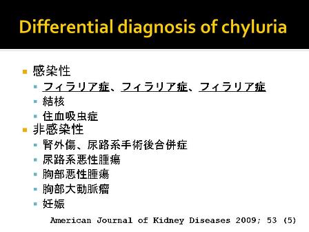 乳び尿の原因としては、リンパ流の停滞、胸管閉塞をきたす病態が鑑別となるが、感染症ならフィラリア、結核、住血吸虫症が、また感染症以外では悪性腫瘍によるものが多いだろうと考えられた。