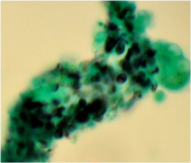 まず、Pneumocystis は基本的に培養されません。ですから、PCPの診断は病理組織学的染色による病原体の特異的な検出に基づいて行なうことがスタンダードです(参考図1、2)。栄養体は、Wright-Giemsa染色法や、その簡易法であるDiff-Quik法で染色することが可能ですが、嚢胞体は染色できません。メテナミン銀染色やトルイジンブルーO染色は嚢胞体を見つけるのに使用されます。免疫蛍光法は、栄養体と嚢胞体の両方とも染色可能で、染色されているかどうかの判断も明快です。