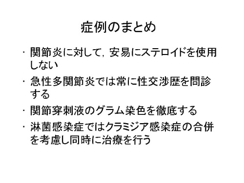 この症例では、最終的に右膝関節穿刺液からNeisseria gonorrhoeae が検出され、最終診断は播種性の淋菌感染症でした。聞くと、commercial sex workerとの接触があったということでした。治療は、クラミジアの同時感染も考慮し、セフトリアキソンとミノサイクリンの併用で行われました。症例のまとめとして表1のような議論がなされました。