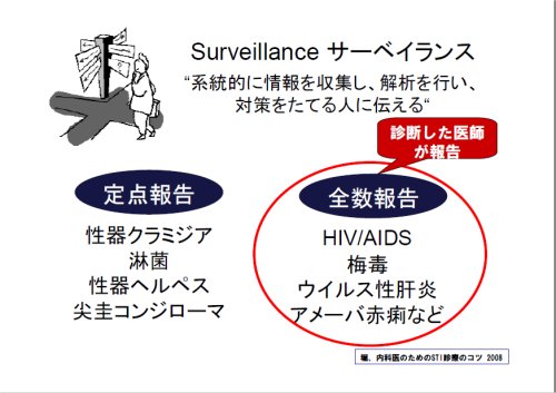 まず最初に、イントロダクションとして、国立感染症研究所の堀成美先生からSTIサーベイランスの重要性、ひいては「医師からの報告の重要性」についてご説明がありました。サーベイランスによってアウトブレイクに対して速やかに対応ができるのはもちろんのこと、様々な政策立案においてもサーベイランス結果がその根拠となることがあります。感染症法で規定されている全数報告疾患にはHIV/AIDS、梅毒、結核、ウイルス性肝炎やアメーバ赤痢などがあり、また定点報告疾患としては性器クラミジアや淋菌、性器ヘルペス、尖圭コンジローマなどがあります(スライド1.詳しくは国立感染症研究所ホームページを参照 http://idsc.nih.go.jp/surveillance.html)。また、正確に診断できていても「報告の必要性を知らなかった」ということは多々あるのではないでしょうか。上記をチェックして報告漏れのないように気をつけたいものです(スライド2)。